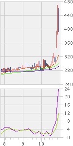 今日も107万株出来。429円の高値あり。大引けは+21円高。