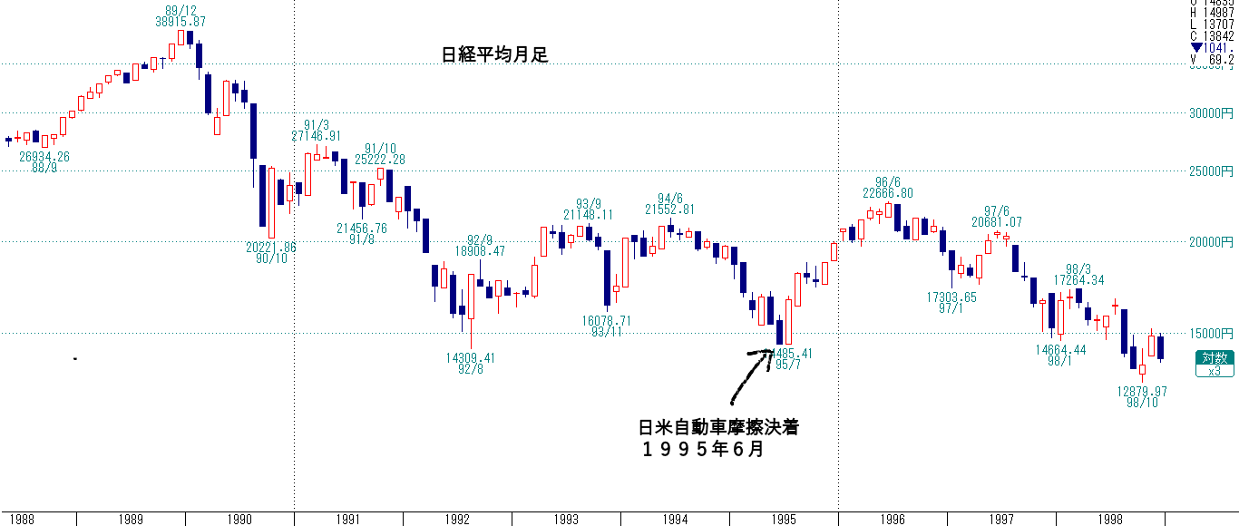 1995年日米自動車摩擦問題が激化していましたが、6月に決着。その後の日経平均はご覧の通りで1年で約6割上昇しました。今は貿易摩擦の決着が見えない段階のため売られているのかもしれません。
