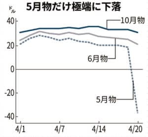 ただ、この異常事態は期近物に限られる。6月物は前日比4ドル程度安い21ドル前後にとどまるほか、10月物は1ドルほど安い31ドル程度だ。この1日で世界の原油の需給の見方急変したわけではない。エネルギー関連企業の株や社債は売られているものの、20日の原油暴落だけでエネルギー企業の破綻につながるとの見方は少ない。 - 20.4.20 21:15